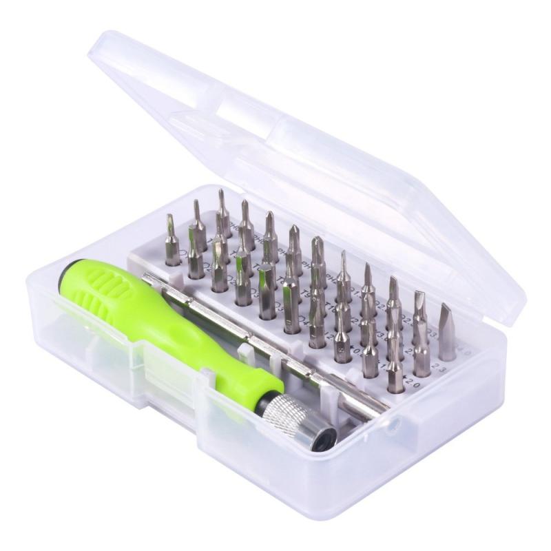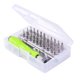 The 32-in-1 Multi-purpose Precision Screwdriver Set is designed for disassembling and repairing various electronic devices. This comprehensive set includes 30 interchangeable bits, a rubber handle, and an extension pliant bar, making it suitable for tasks involving mobile phones, PDAs, PCs, and other electronic equipment.