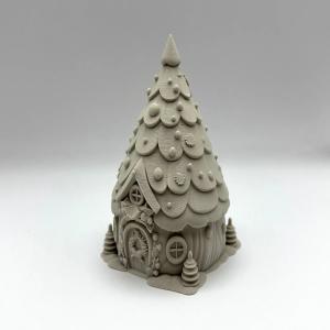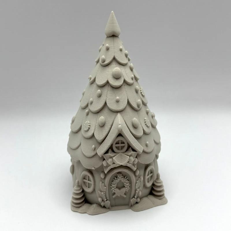 Shaped like a snow-dusted fir tree, this whimsical miniature cottage is brimming with festive details—from scalloped “shingles” dotted with baubles to a wreath-adorned arched door and twin circular windows that peer out like twinkling fairy lights. PLA + size 73 x 77 x 99 mm