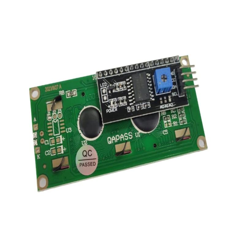 This is a 16x2 LCD display screen with I2C interface. It is able to display 16x2 characters on 2 lines, white characters on blue background.