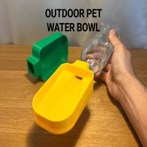 Outdoor pet water bowl with bottle attachment. Portable, reusable, no-waste design for walks and trips. PLA + Size 80 x 140 x 32 mm