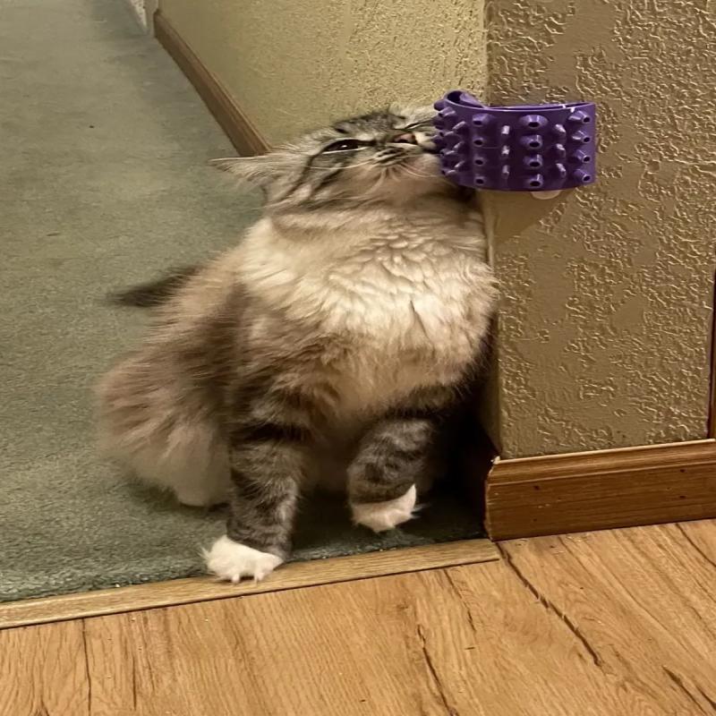 A device that can be mounted on a corner, where cats can walk past it and scratch their cheecks. Fillable with catnip. PLA + Size 73 x 73 x 70 mm