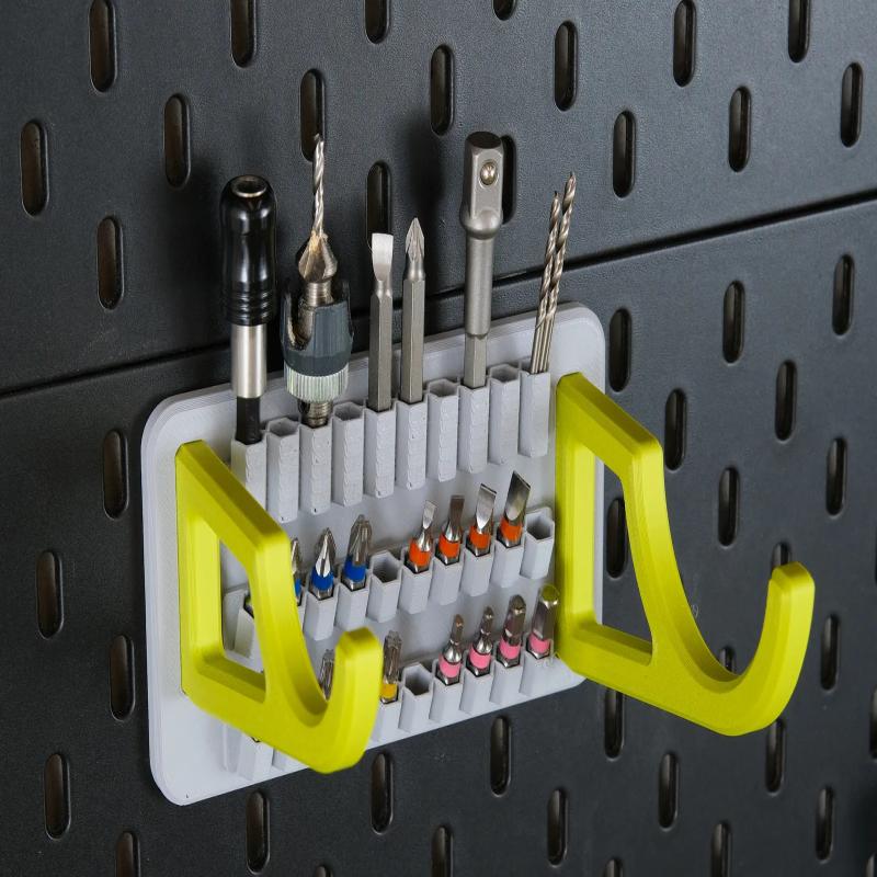 The hooks allow easy access to the drill and leave space for storing bits and accessories bellow. PLA + size
