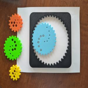 This is inspired by Spirograph Jr, which is a spirograph set with large gears and larger holes meant for littler kids who struggle with the small gears of a regular spirograph set.