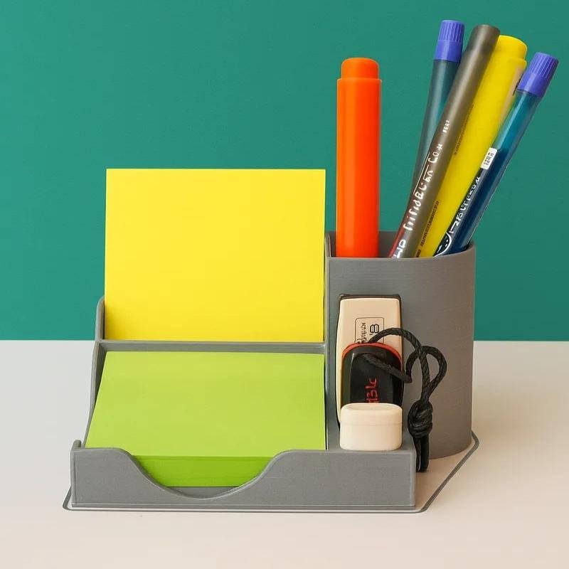 This 3D-printed organizer is designed to keep your pens, sticky notes, and USB drives always within reach. Its compact and modern design makes it perfect for any workspace. Say goodbye to clutter and add a pro touch to your desk. Material PLA+. Size 128x100mm