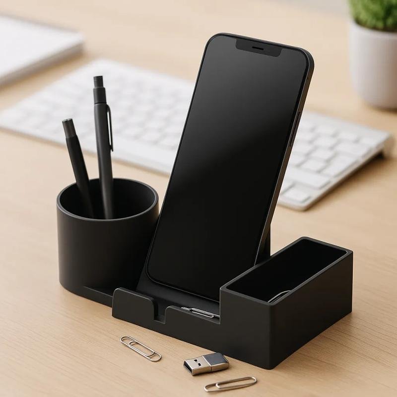 Phone stand fits most smartphones with tray for USB drives, paper clips & small accessories. Material PLA+. Size 180x90mm.