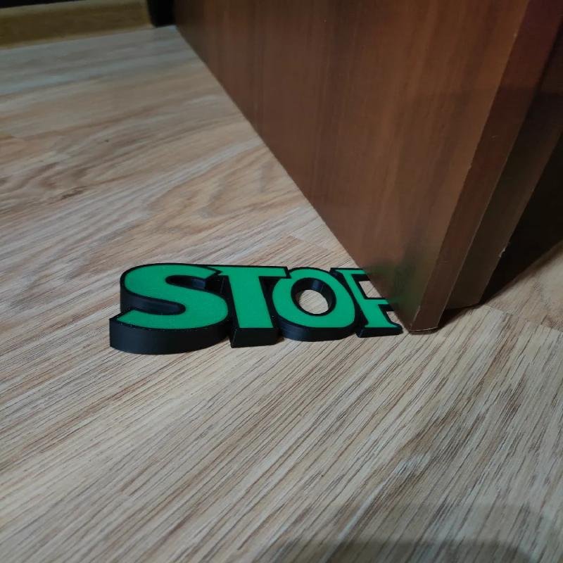 A door stopper in the shape of the word "STOP." It has a very stylish look, and its shape prevents doors from closing and slamming shut.