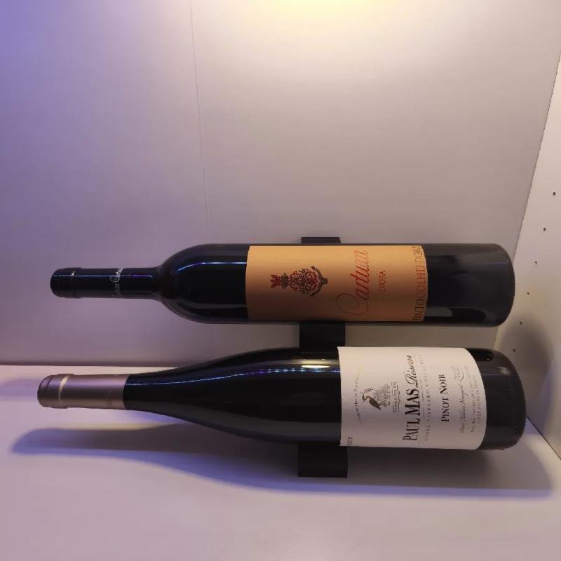 Minimalist dual wine bottle holder for horizontal storage and display. PLA + Size 72 x 183 x 183 mm