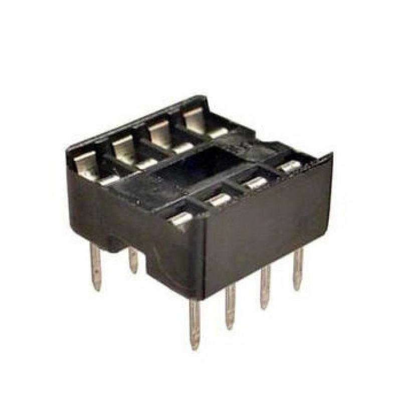 The 8-Pin IC Base (DIP Socket) is designed to securely hold dual in-line package (DIP) ICs, allowing easy insertion and removal without soldering the chip directly. It helps protect ICs from heat damage during soldering and makes replacement simple.